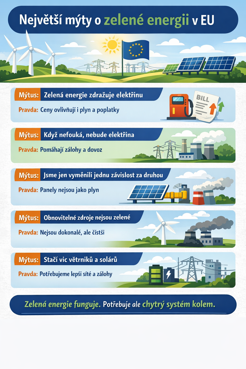 Zelená energie tedy není všelék. Ale není ani strašák, za kterého ji někteří vydávají. Funguje — jen potřebuje dobře nastavený systém kolem sebe.