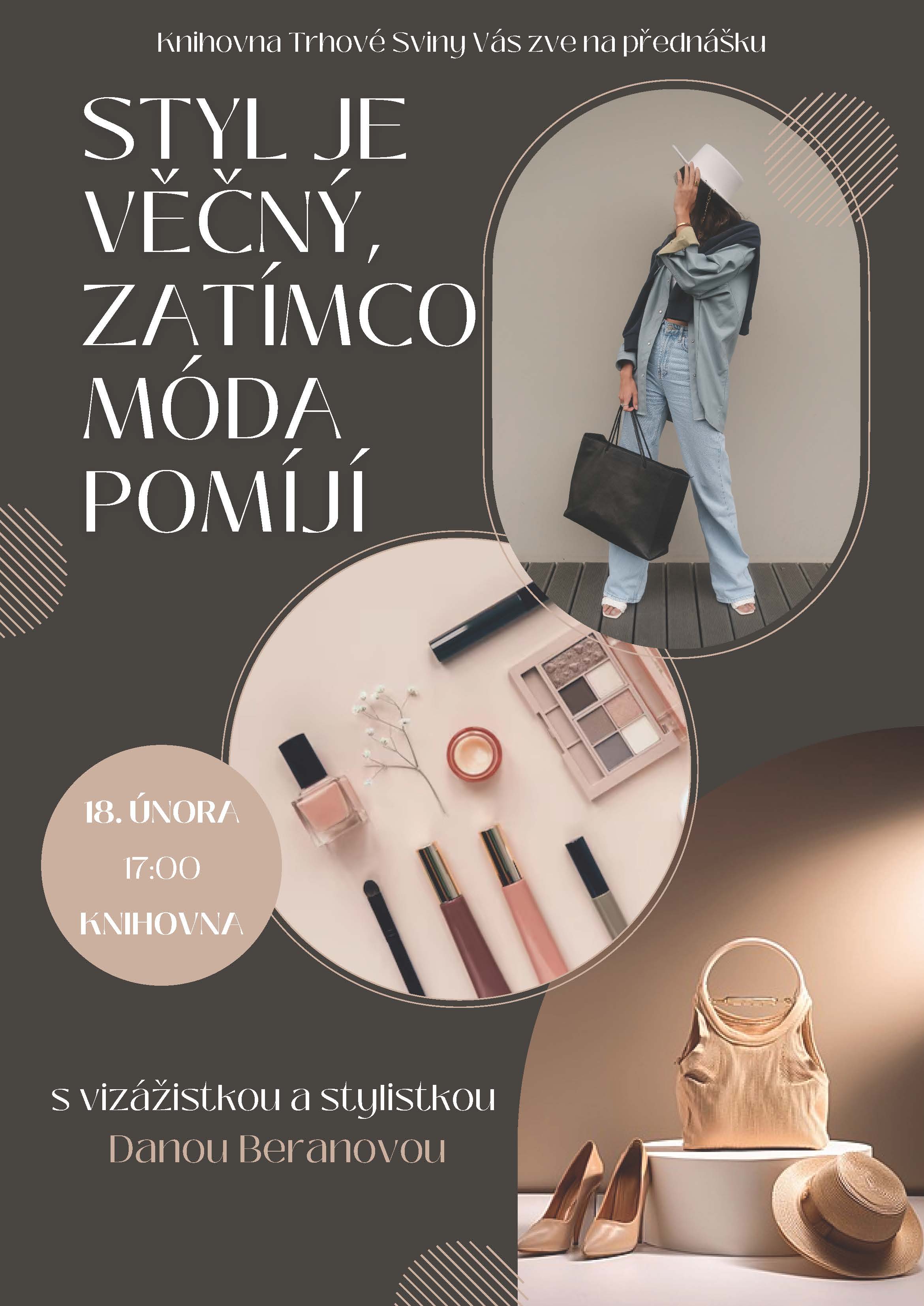 18.2. – STYL JE VĚČNÝ, ZATÍMCO MÓDA POMÍJÍ – TRHOVÉ SVINY, KNIHOVNA: Ve středu 18. února od 17:00 zve Knihovna Trhové Sviny na přednášku s vizážistkou a stylistkou Danou Beranovou s názvem Styl je věčný, zatímco móda pomíjí. Čeká vás inspirativní podvečer o tom, jak si najít vlastní styl, který nepodléhá trendům, jak pracovat s šatníkem i doplňky a jak podtrhnout osobnost líčením a správnou kombinací barev. Pokud vás baví móda, ale nechcete být její obětí, tohle je akce přesně pro vás.
